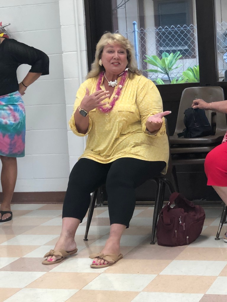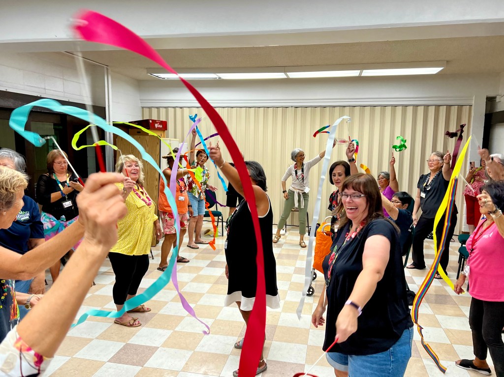 We had a special treat at this week’s rehearsal — a coaching session with Region 12 visual coach Pamela Johnson! In addition to waving colorful ribbons in time with the beat for warmups, we sported paréos and inflatables in rainbow colors in keeping with this week’s “beaches” theme.