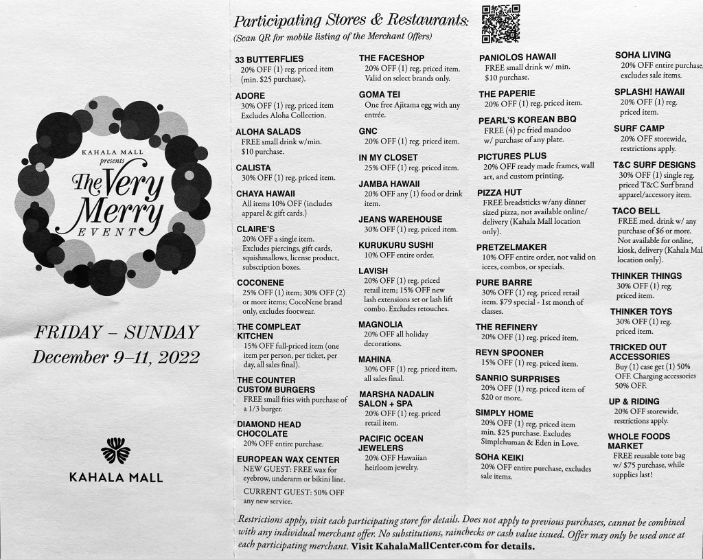 For just $5.00, the Very Merry savings pass offers you discounts, in-store specials and giveaways at nearly fifty stores and restaurants at Kahala Mall, Friday December 9 though Sunday, December 11, 2022.