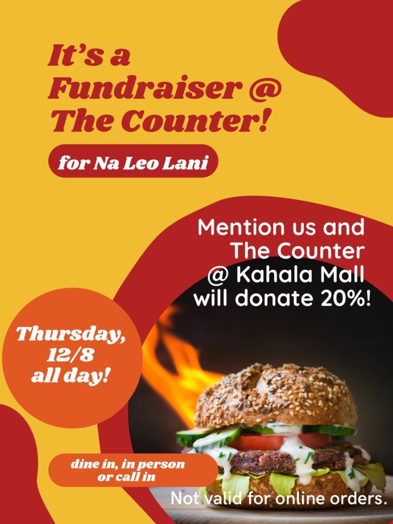 Na Leo Lani’s fundraiser at The Counter is happening all day on December 8, so you can also eat lunch there, order by phone, or put in an in-person take out order. (Online orders are not valid for the fundraiser.)