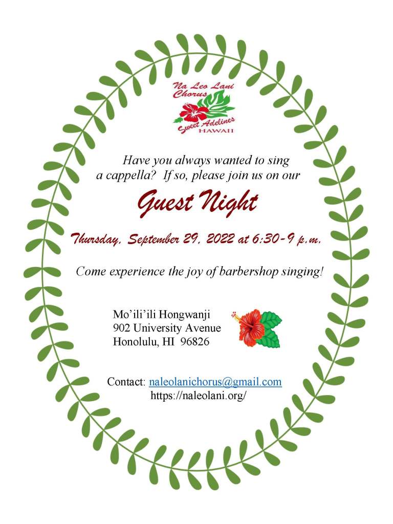 Do you like to sing, meet new people, and make new friends? Then join us for a musical night of barbershop at our Na Leo Lani guest night! See flyer below for details.