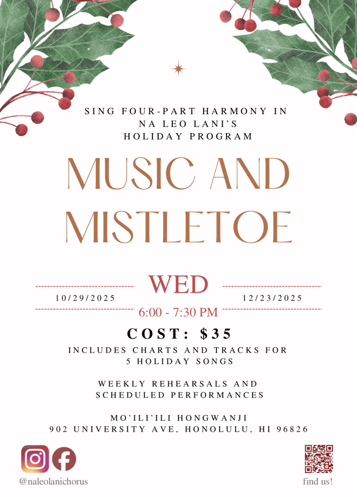 Contact naleolanichorus@gmail.com for more information, or simply come to our rehearsals and check out Music and Mistletoe for yourself!