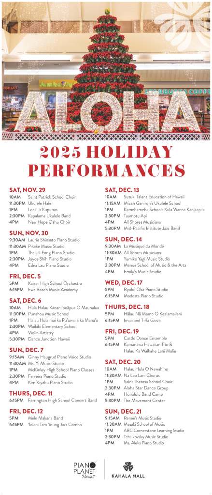 Whether you’re out shopping for last-minute gifts or browsing the library for a book to curl up with amidst this rainy winter weather, you’re in for a musical treat with not one but two free performances by Na Leo Lani! We will be at Kahala Mall on Saturday, at 11:30 a.m. (see Kahala’s Saturday line-up below) and at Kaimuki Public Library on Sunday at 2 p.m. Come join us!